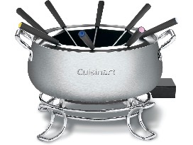 Afterwards, you will be able to create your own Fondue experience at home with this Cuisinart 3 Quart Fondue Pot! This 3-quart capacity 1000-watt electric fondue set is suitable for chocolate, cheese, broth and or oil. Nonstick interior and dishwasher safe makes this product easy to clean up. The Cuisinart elegant brushed stainless Fondue set includes a base, bowl, temperature probe, 8-fondue forks, and fork rack for the full fondue experience - also includes instruction and recipe booklet with lots of fondue options.