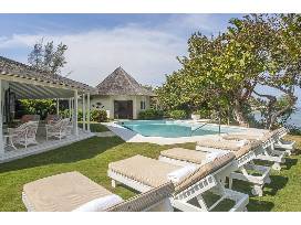 Found at the far eastern end of Country Club Drive, bordering the ocean and surrounded by a very large, beautifully mature garden, is a very special home featuring an enchanting private oceanfront location, private pier and intimate beach alcoves, a private pool, exceptional garden with lawns for children to play about on. Two golf carts are at the villa, and you are only steps away from the 18-hole Golf Course (Fees additional).