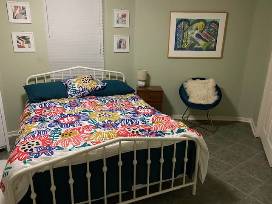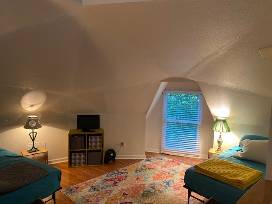 -2 bedrooms, 1 queen and 2 singles, plus a small sitting room with TV on the bottom floor