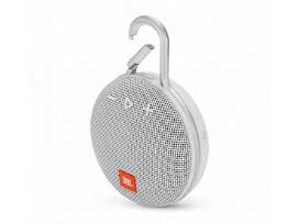 *JBL Clip 3 Portable Bluetooth Speaker with Carabiner in Steel White. This ultra-rugged and waterproof speaker is small in size, but big on sound. ($50)