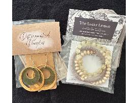 - Distinguished Dangles - Pair of Handmade Wooden Gold & Green Double Hoop Earrings. ($15)