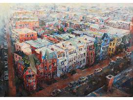 incorporates an expressive palette. Using an aggressive collage sensibility, he creates cityscapes, architectural portraits, and figurative snapshots of everyday life in the American city. He aims to capture the rich texture of these places and moments-the humor, drama, despair, and surprising beauty. Along with narrative and conceptual content, technical mastery and innovating materials drives his work.