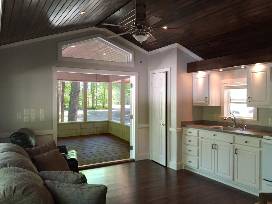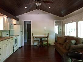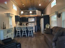 Cottages have an open floor plan, sleeping 4-6. RVs are Salem VBDS36 floor plan. Two private bedrooms; one has a queen and the other a queen plus two overhead bunks.