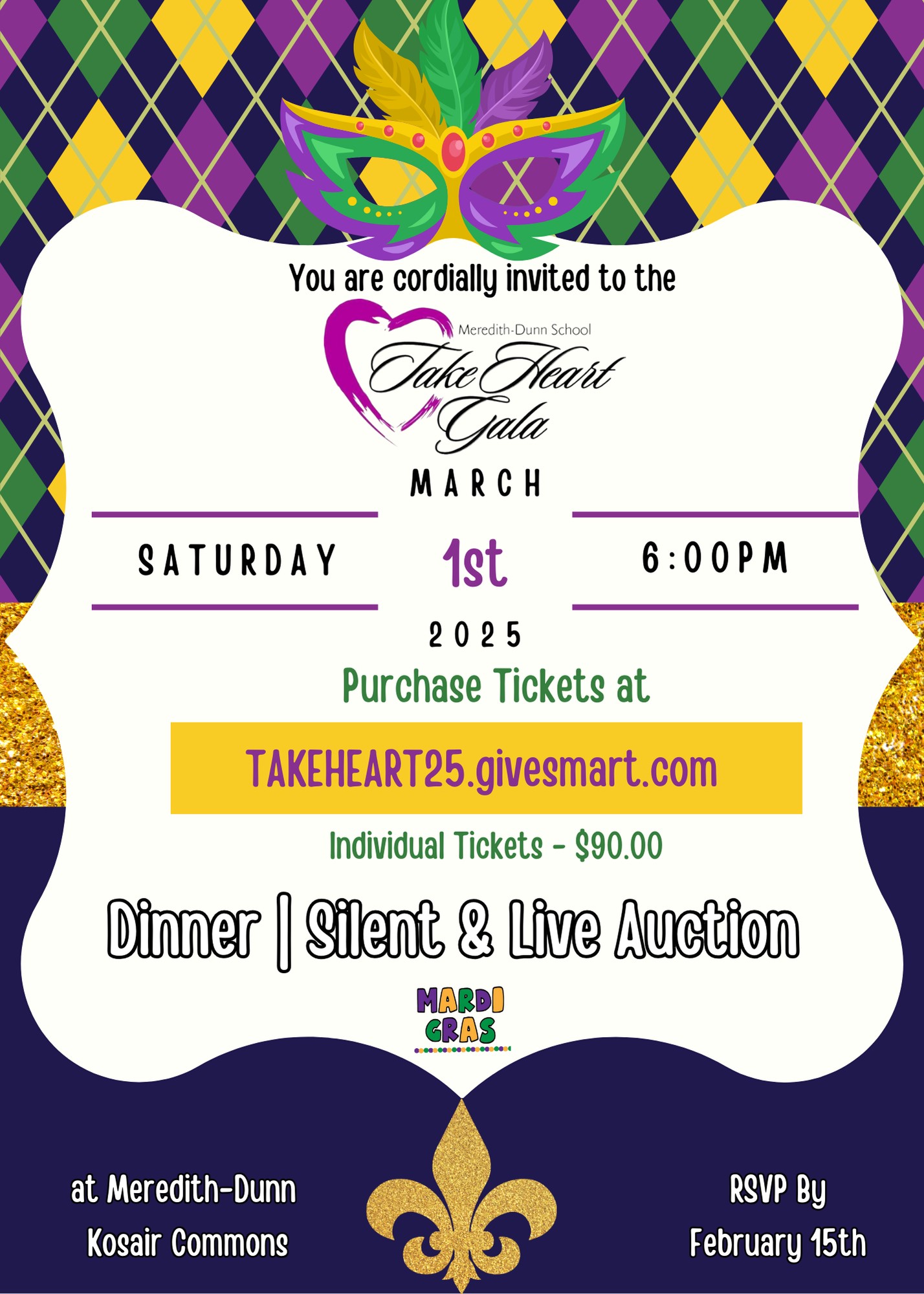As a non-profit organization, we rely on our fundraising events to bridge the gap between tuition and the actual cost of educating a child at Meredith-Dunn. Our annual Take Heart Gala serves as our primary fundraiser, raising funds through a combination of silent auctions, live auctions, bourbon pulls, and sponsorships.