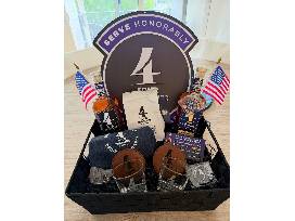 This auction gift basket contains 1 bottle of Four Branches Founders Blend Bourbon, 1 bottle of the Continental limited release, 2 Four Branches glasses, 2 Four Branches Coasters, 1 Four Branches T-Shirt, 1 bag of Four Branches Coffee, 1 250th Challenge Coin, 1 Four Branches Challenge Coin, 1 Four Branches lapel pin, 1 Four Branches Tacker Sign.