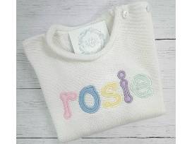 This adorable pull over sweater is perfect for your child or grandchild. You have your choice of correct size and child's name. From fingerprints new york. Applique with embroidery.