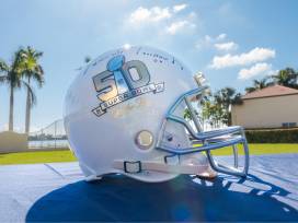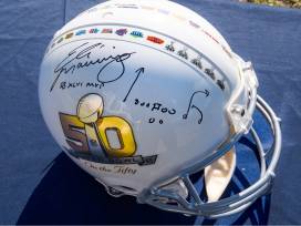 Eli Manning Signed Super Bowl 50 "On The 50" Authentic Helmet - This limited-edition collector's piece (only 15 ever made) is personally signed by two-time Super Bowl champion Eli Manning. The helmet features Manning's signature along with the inscription "Super Bowl XLVI MVP", commemorating his legendary performance. Additionally, it includes a special inscription of the iconic Mario Manningham play, a defining moment in Super Bowl XLVI. A must-have for any Giants fan or memorabilia collector!