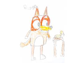 I drew Bluey and Bingo and Chemo Duck. I like watching Bluey because it is funny and I learn stuff from watching it. I also like all the different characters. Chemo Duck is a stuffed animal that I got from the doctors when I first started chemo. He has a port and a bandage. NF is something you can be born with, and it makes your life kind of difficult. I have a tumor in my brain, and I have to take pills every day to help get rid of it. I go to the doctor a lot so they can check it out and make sure nothing bad happens.