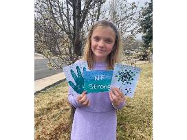 Maggie is a 5th grader who loves to be active and adventurous. She enjoys playing outdoors, skiing, biking, swimming and indoor rock climbing. She was diagnosed with NF at age 6 and just finished a 2.5 year long treatment of Selumetnib for a plexiform neurofibroma on her spine. This year, she decided to make her artwork about all the beauty and strength of NF heroes. She used watercolors, finger painting and dot markers to make her art.