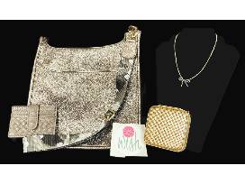 Beautiful and functional, this textured bronze shoulder bag, gold glitter jewelry case, credit card holder, and gold-toned beaded necklace with a silver beaded bow will delight you.