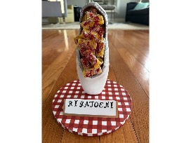 Whimsical, hearty, and full of flavor, Bon Appétit is a culinary-inspired pointe shoe overflowing with personality-and pasta! Created by Mary Lynn Egizii and Trish Cunningham, this one-of-a-kind design features a perfectly plated "rigatoe-ni in red sauce" delicately served in a classic white pointe shoe.