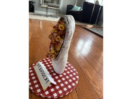 Mary Lynn crafted this deliciously fun piece as a tribute to her Italian heritage and her lifelong love of dance, blending tradition and artistry into one unforgettable creation. A true feast for the eyes, Bon Appétit brings bold flavor to the "It's All About the Shoe" campaign-mangia and vote!