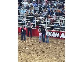 Two (2) children, at least five (5) years of age, will be on the arena floor to drop their hat to start the Calf Scramble during the Thursday, February 26, 2026 rodeo performance. This package includes four (4) lower bowl tickets to the Rodeo Performance, along with dinner for four (4) at the Frontier Club prior to the rodeo performance.