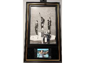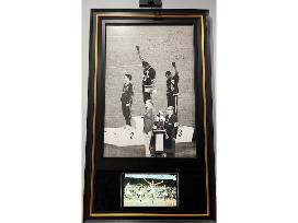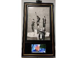 Adding to this remarkable display, the 32" x 55" custom frame also includes a remote-controlled tablet that continuously loops footage of this historic event, allowing you to relive the moment that transcended sports and became a lasting symbol of social change. This is more than memorabilia - it's a statement of history, activism, and bravery.