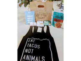 - Tacotarian "Taco Lover's Vegan Delight" Gift Set: From the wildly popular vegan taco shop with a mission to "Save the World One Taco at a Time," this set is packed with tasty treats and fun swag including a $25 Tacotarian Gift Certificate, "Eat Tacos Not Animals" Tank Top (Size S), Tacotarian Plant-Based Barbacoa and a voucher for a margarita!