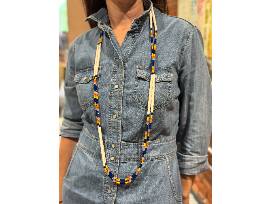 - The other offers an elegant composition of long white beads accented with striking hues of blue, orange, and yellow for a bold yet graceful look.