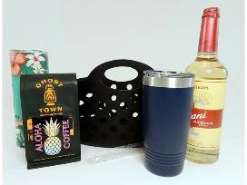 Calling all coffee enthusiasts! This Aloha Coffee auction item includes everything you need to enjoy quality coffee from the comfort of your home or on the go. Perfect as a gift or personal treat this basket includes (5) Aloha Coffee drink cards, coffee beans, flavoring, and travel mugs.