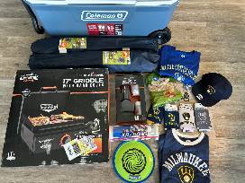Get ready for the ultimate tailgating experience with this all-in-one package ($375 value). It includes a 17" Blackstone Griddle ($150 value) for cooking up your favorite game day treats, a large Coleman cooler ($75 value) to keep your drinks cold, and two folding chairs ($50 value) for comfortable seating. Also included are a 5-piece grill kit ($40 value), two Milwaukee Brewers T-shirts ($50 value), a Brewers hat ($25 value), a bottle opener keychain ($10 value), four can koozies ($10 value), a pong game ($30 value), and a frisbee ($10 value) to keep the fun going. Everything you need to enjoy the game in style and comfort! Perfect for any sports fan or outdoor enthusiast.