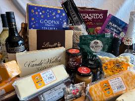 1Indulge in the perfect pairing with this premium wine and cheese basket. It includes a bottle of Monterra Merlot 2022, a bottle of Charles Shaw Pinot Grigio 2022, and a bottle of Freixenet Cordon Negro. Enjoy sipping in style with two champagne flutes, and satisfy your sweet tooth with an 8 oz box of VandeWalle's assorted chocolates, two VandeWalle's candy bars, and an assortment of fine cheeses. Plus, enjoy a $50 Lamers gift card to further elevate your indulgence. This beautifully presented basket is perfect for any occasion. Must be 21 to purchase. $160 value