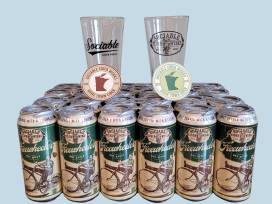Enjoy a refreshing Sociable Cider Werks Bundle featuring six 4-packs of Freewheeling hard cider, two branded glasses, and two stickers. Perfect for cider enthusiasts or anyone looking to sip something delicious and locally crafted.