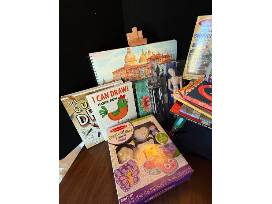Thank you Rainbow Booksellers in the Washington Heights neighborhood for this innovative package to keep kids creatively engaged. Includes crafts, drawing books and tools, a ukulele, a puzzle, stickers, books, and so much more!