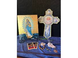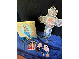 Our Lady Star of the Sea - Stella Maris Icon is a stunning icon crafted on alder wood and hand-gilded with gold leaf. It was created by the same Polish artist who created the icon displayed in the Jubilee Shrine at the Basilica. The cross, rosary, bracelets, and holy cards accompanying it are cherished mementos from the Jubilee Year.
