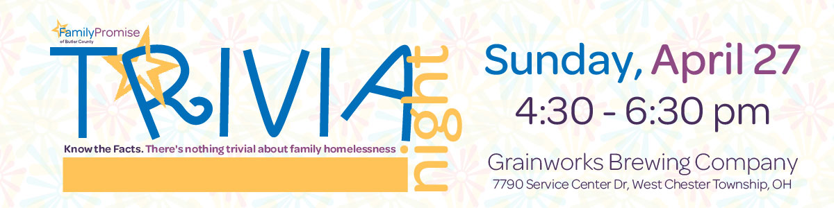As a Trivia Night Sponsor, you will join Family Promise of Butler County and other community leaders, business partners, and Butler County citizens to help eradicate family homelessness in a FUN but IMPACTFUL way - to help us in our vision of creating a community where every family has a home and a future of promise!
