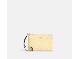 Our Corner Zip Wristlet is an everyday essential that won't weigh you down. Crafted of signature canvas in Hay, this small wristlet is compact yet functional, with space for your keys, cards and even an iPhone (up to a 15 Pro Max). This small corner zip wristlet features a wrist strap for ease and a zip-top closure to secure your items. To keep your cards handy on the go, organize them in the convenient built-in slots. Measurements: Length: 6.25", Height: 4.0", Width: 0.5"; Materials: Signature coated canvas, Fabric lining; Features: Two credit card slots, Zip-top closure, Wrist strap attached.