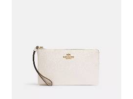 Our Corner Zip Wristlet is an everyday essential that won't weigh you down. Crafted of pebbled leather in Chalk, this small wristlet is compact yet functional, with space for your keys, cards and even an iPhone (up to a 15 Pro Max). This small corner zip wristlet features a wrist strap for ease and a zip-top closure to secure your items. To keep your cards handy on the go, organize them in the convenient built-in slots. Measurements: Length: 6.25", Height: 4.0", Width: 0.5"; Materials: Refined pebble leather, Fabric lining; Features: Two credit card slots, Zip-top closure, Wrist strap attached.