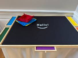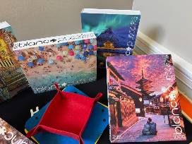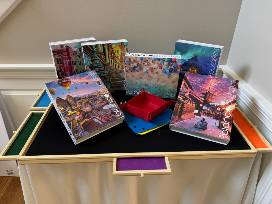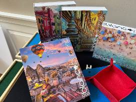 Puzzle table with 6 puzzles (3 x 1000 piece and 3 x 500 piece blanc puzzles)