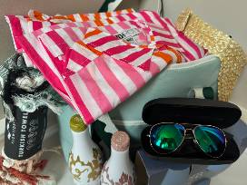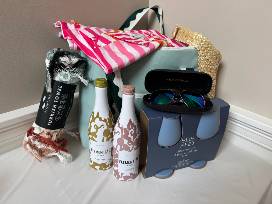 Slowtide Zoey Turkish Beach Towel, Beach Riot Sraw Visor, Christian Siriano Aviator Gold Sunglasses, Alexa Swim Cover Top in sizses S/M and L/XL, Business & Bleasure Co. Cooler Tote Bag, Silicone Wine Goblets, ELEMENT(AL) Wine