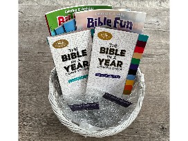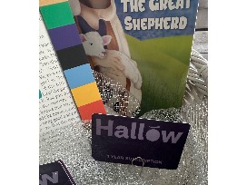 2-One Year Hallow App Subscriptions, Bible in a Year Companion Book, and four Religious Coloring Books