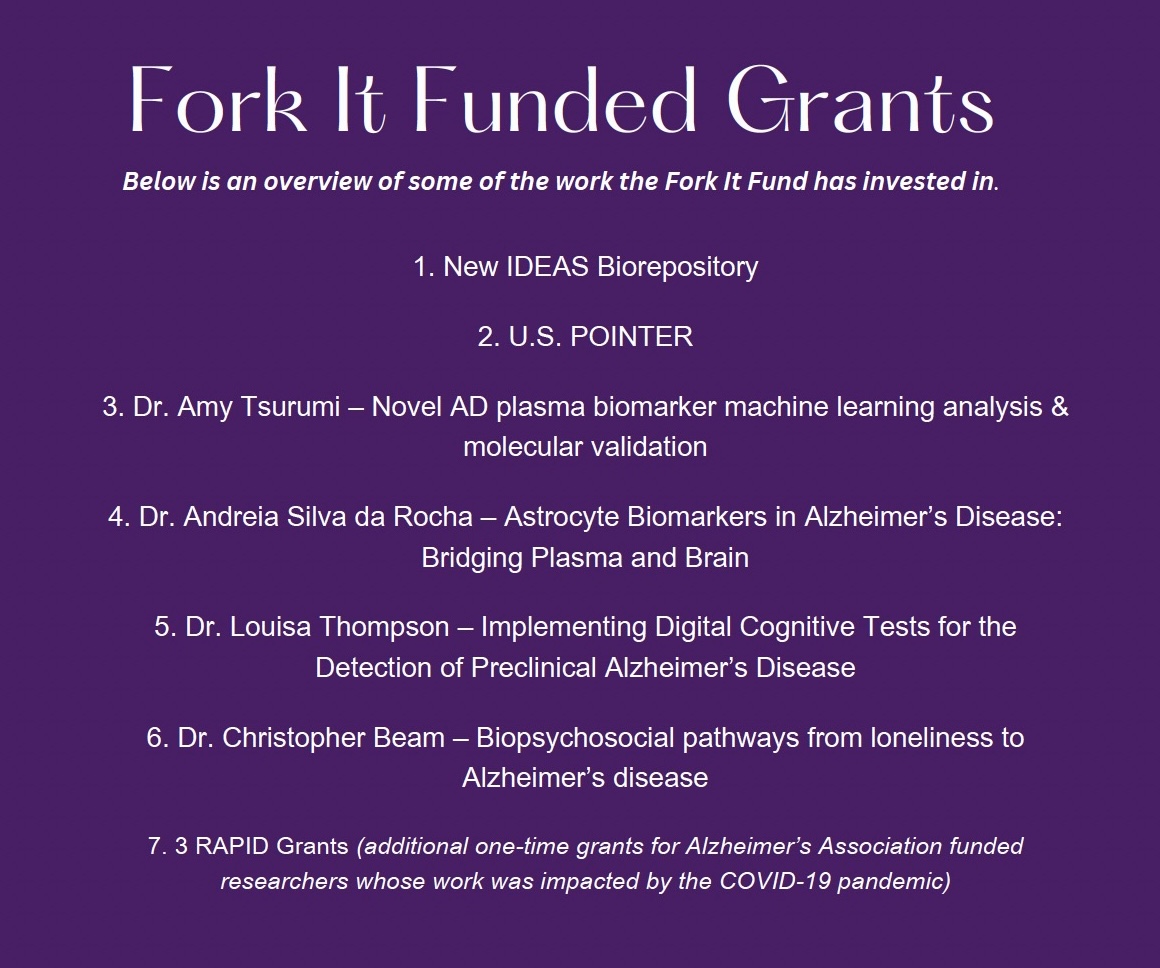 Fork it Alzheimer's was established in partnership with the Alzheimer's Association with a singular mission: to directly fund transformational research focused on preventing Alzheimer's and other dementias.