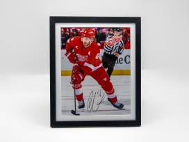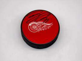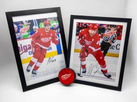 Detroit Red Wings Captains Package: containing an autographed puck from Captain, Dylan Larkin, and autographed photos from Assistant Captains Andrew Copp and Ben Chariot.