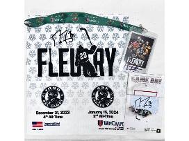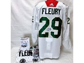 Own a piece of Wild and NHL history when you bid on this exclusive package highlighting the marvelous "Flower," #29 Marc-Andre Fleury, and his historic accomplishments. This package includes a NEW, UNWORN, LIMITED EDITION, AUTOGRAPHED replica warm up jersey, size 56, created to celebrate goaltender #29 Marc-Andre Fleury's historic 1,000th game. With this package you will also take home a custom rally towel, commemorative ticket, and game program from the Minnesota Wild's celebration of Fleury's 552nd win and 1,000th game on February 9, 2024 against the Pittsburgh Penguins. Certificates of authenticity available upon request.