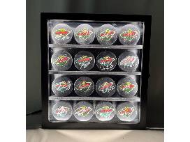Build up the elite status of your hockey puck collection by bidding on this incredible 16 puck set light up hockey display filled with autographed Minnesota Wild hockey pucks! Pucks are signed by #5 Jake Middleton, #7 Brock Faber, #12 Matt Boldy, #13 Yakov Trenin, #14 Joel Eriksson Ek, #17 Marcus Foligno, #23 Marco Rossi, #24 Zach Bogosian, #25 Jonas Brodin, #29 Marc-Andre Fleury, #32 Filip Gustavsson, #36 Mats Zuccarello, #38 Ryan Hartman, #46 Jared Spurgeon, #89 Freddy Gaudreau, and #97 Kirill Kaprizov.