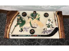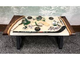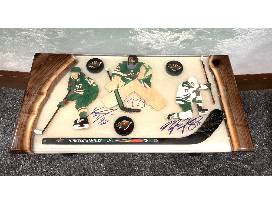 This 35"Wx17.5"Dx18"H table is the perfect addition to any Wild fan's den or fan cave! Handmade by local craftsman, Matt from Rough Sanded Woodworking, this one-of-a-kind table features black steel criss cross legs, a Minnesota Wild mini stick, three Minnesota Wild hockey pucks, and action cutouts of #29 Marc-Andre Fleury, #97 Kirill Kaprizov, and #17 Marcus Foligno all encapsulated in this gorgeous resin table top. Table itself has been autographed by #29 Marc-Andre Fleury, #97 Kirill Kaprizov, and #17 Marcus Foligno. LOCAL PICK UP ONLY. Item does NOT ship.