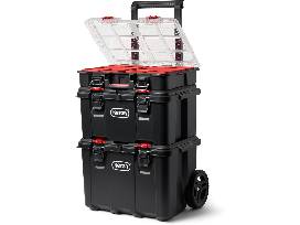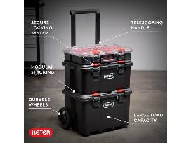 Keter's Stack-n-Roll modular tools organizer for garage storage and DIY projects has a secure locking system, telescoping handle, modular stacking, durable wheels and a large load capacity.