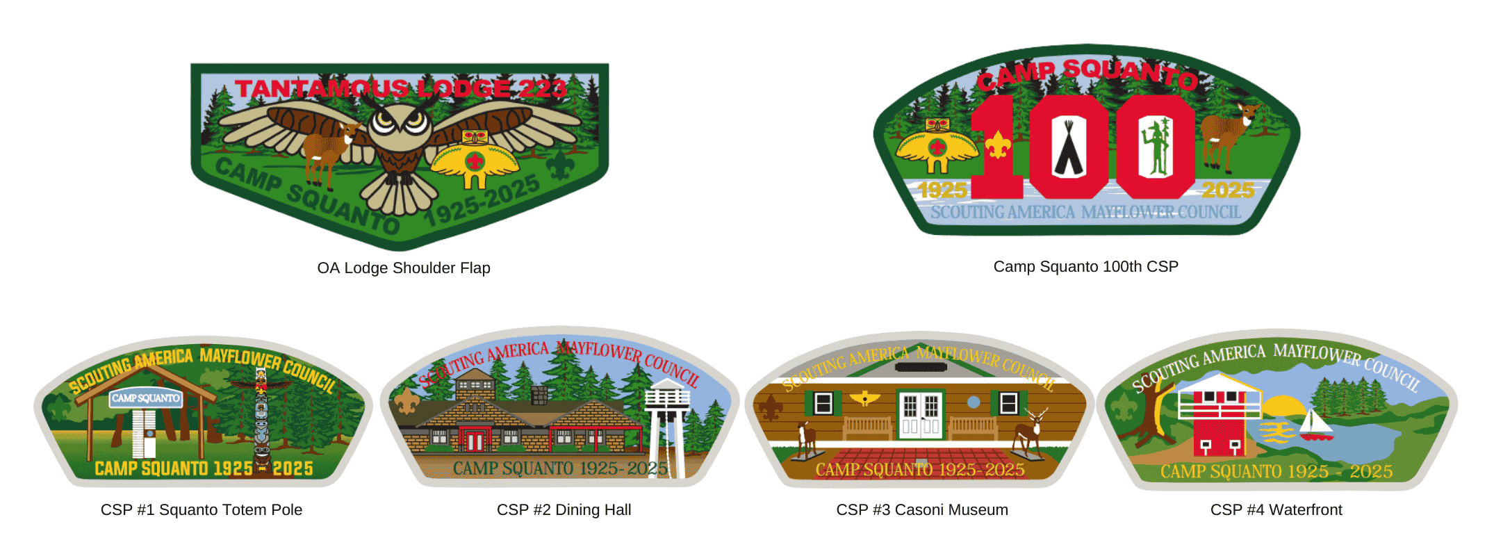 2025 marks the Centennial Anniversary of our premier campground, Camp Squanto. Celebrate it's rich history with limited edition patches marking 100 years of Squanto and highlighting some of the iconic landmarks on camp grounds.