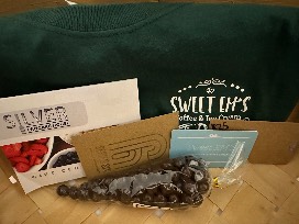 $50 Sweet EM's gift card, $25 Maplewood Deli, $20 Silver Pancake, $15 Series Six, t-shirt, chocolate espresso beans