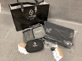 Plus Station Park logo swag includes shopping bag with jersey knit blanket with logo; travel gadget organizer; USB charging cord and lip balm.