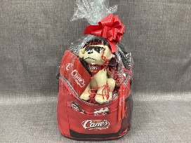 Mouthwatering Raising Cane's Gift Cards: 4 cards - The Box Combo; 2 cards - Kids Combo & 2 cards - 22 oz lemonade cards. Plus Raising Cane's logo swag includes red drink cooler, key chains, drink cozy, stuffy dog, chapstick; 2 shirts (red/blue L); 2 hats (red & black) and pens.