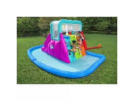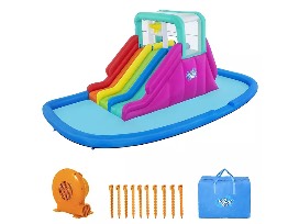Triple the fun with H2OGO! Triple Splash Mega Water Park. This water park offers triple the fun with three unique slides. Kids can race their friends up the triple climbing wall, outfitted with individual padded handles and footholds for safety. Once they reach the mesh tower peak, they'll have to choose between three different slides, each offering a unique way to splash into the pool below.
