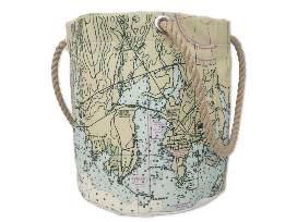This beverage bucket bag features a nautical chart of the Mystic/Stonington shoreline with six (6) interior pockets sized to hold a six-pack of your favorite beverage - with hemp rope handles for easy carry. Fill the center with ice and you've got a perfect collapsible cooler. Melting ice escapes through a grommet hole in the base of the water-resistant recycled sail cloth. When not being used as a beverage tote, its uses indoors-and-out are only limited by your imagination.