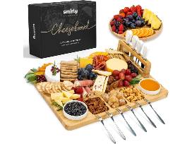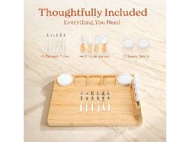 No party is complete without some good nosh. Elevate your hosting game with this beautifully crafted and generously sized SMIRLY Charcuterie Board Set, made from eco-friendly natural bamboo and designed to impress.. A magnetic holder keeps four cheese knives upright and within easy reach, while two ceramic bowls and six stainless steel forks enhance your serving options-ideal for dips, spreads, and garnishes.