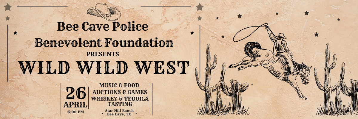Join us on Sat. April 26th, 2025 from 6-10pm for the Bee Cave Police Benevolent Foundation's annual Gala as we recognize and support local law enforcement officers and the brave officers of the Bee Cave Police Department . We'll enjoy a night in the "Wild Wild West" at our very own Star Hill Ranch with tons of fun and entertainment including whiskey tasting in the saloon, tequila tasting on the patio, food, music, auctions and more! Buy your table today, invite your friends and join us for a night in the Wild Wild West!
