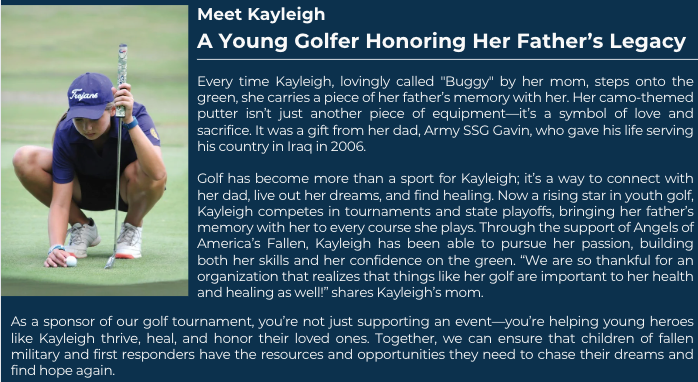 Join us on Monday, April 14, 2025 as we invite our community partners in honoring our fallen military and civilian first responders by supporting the dreams of their children. The tournament will be held at Bridlewood Golf Club, Flower Mound, TX.