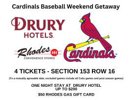 4 tickets to a St. Louis Cardinals Game. Section 153, row 16, seats 10-13. To a mutually agreeable date, excluded games include all Cubs games and post season games. One night stay at any Drury Hotel, up to $200. Certificate for hotel stay expires March 23, 2026. $50 Rhodes gift card, does not expire.