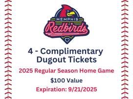 This certificate is good for (4) complimentary dugout tickets. This certificate may be redeemed for any 2025 Memphis Redbirds regular-season home game. May not be redeemed for 7/4/2025 game. All games are subject to availability. May not be redeemed for cash. Excludes seating in prospect row sections. Expires 9/21/2025.
