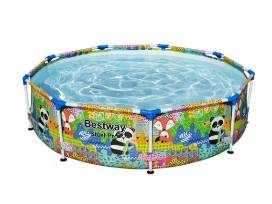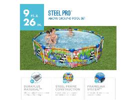 Bestway Steel Pro 9' x 26" Above Ground Round Outdoor Swimming Pool in Panda Print. Spend your summer on the water in the large 851-gallon above-ground pool with colorful animal graphics on the side, Attractive, colorful graphics pool easily sets up and dismantles for off-season storage, requiring no tools for assembly, Round 9-foot swimming pool provides a great way for the family to splash around in the sun all summer long, Connects to a hose with a built-in flow control valve to quickly and easily fill up or drain away pool water, Built with a corrosion-proof steel frame held together by the FrameLink system to provide remarkable connection,
